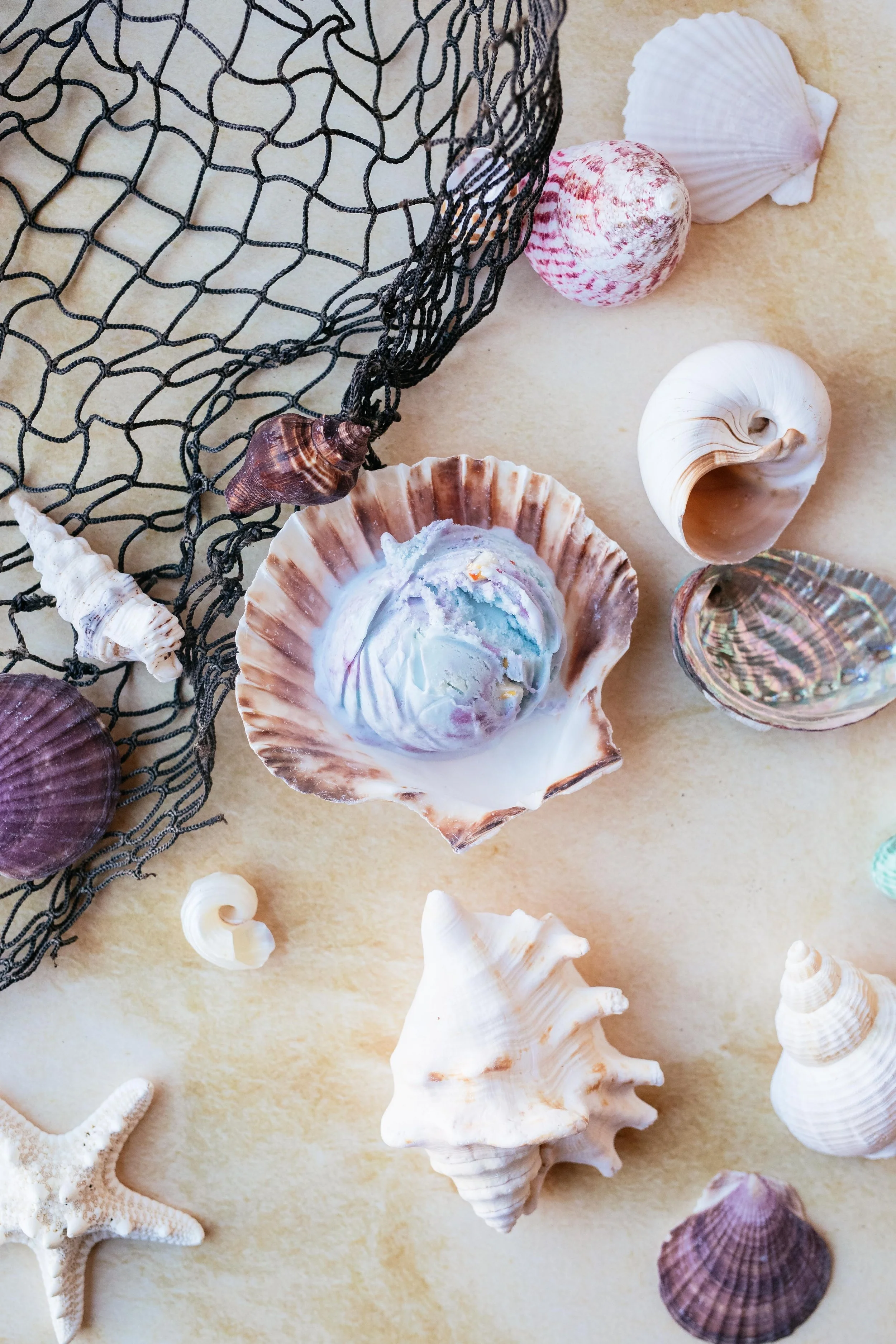 Blue sweet cream base with cotton candy swirl and white chocolate treasure